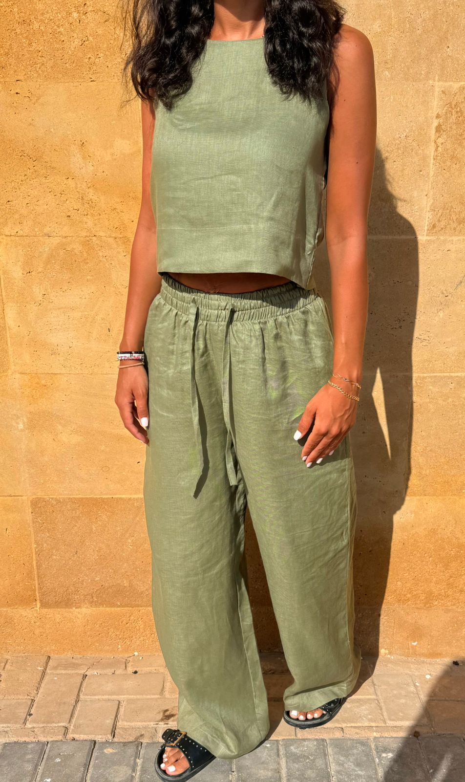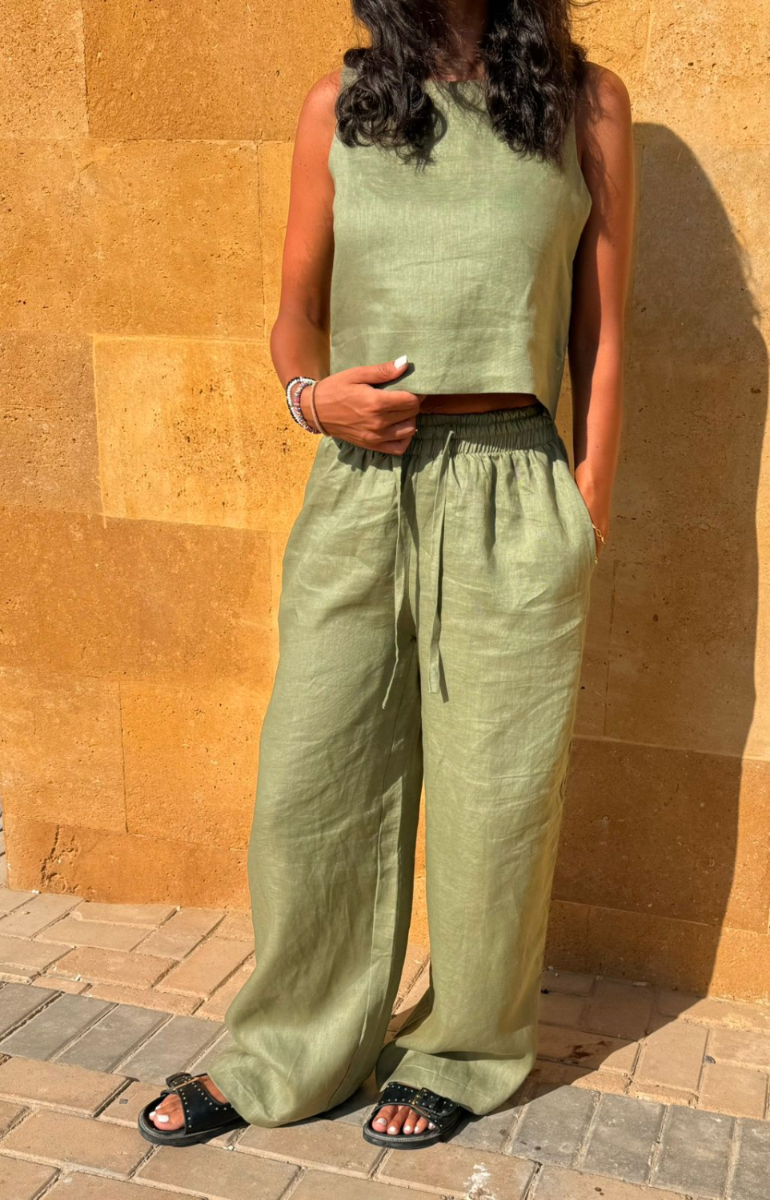 A laid-back look that still feels put-together. This two-piece linen set features a clean-cut sleeveless crop top paired with high-waisted wide-leg pants. Designed in a breathable linen with a relaxed fit, it’s perfect for hot days and easy transitions from casual to dressed-up.